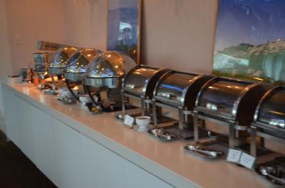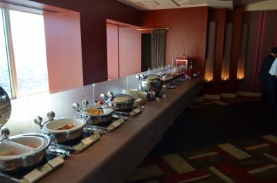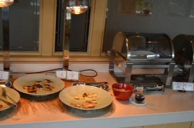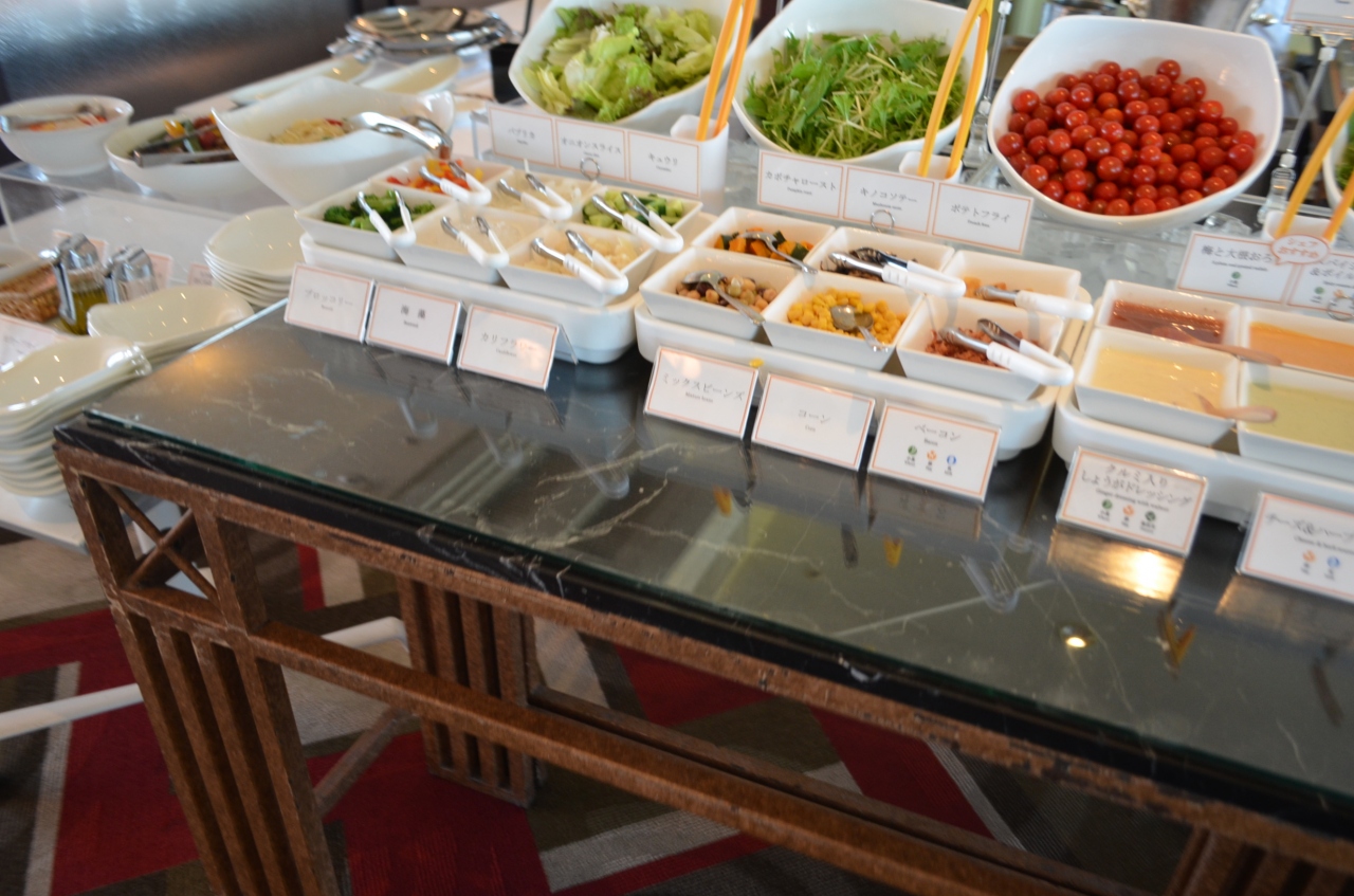 大街道商店街に近い場所です。全日空ホテルの十四階、お城が正面に見えます。朝食はビュッフェ形式です。オムレツは注文に応じてその場で焼いていただくようになっています。鯛飯もお粥もあります。その他、おかずも選び放題です。大満足の朝食です。