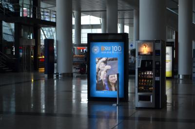 かなり都心から離れています。列車では半時間ほどがたごと走ると、放送も標示もない中央駅に着きました。復路はバスで向かいましたが、少し余分に時間がかかったように思いました。空港内に、共有のラウンジがありました。