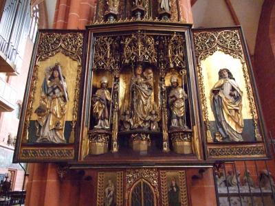 市役所やレーマー広場よりも東にあります。中央駅からはかなりの距離です。フランクフルト市内で最も大きく、格が高い大聖堂であるためか、単に「ドム」と言えばこの聖バルトロメウス大聖堂を指すようです。赤い岩で造られた聖堂内部は、立派な祭壇や絵画類で荘厳されています。