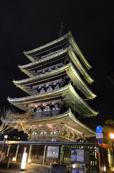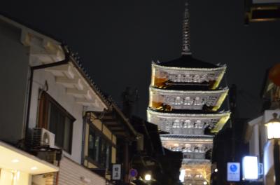 四条通の突き当たり、八坂神社から五条に向けて歩いて行くと五重の塔が見えます。これが法観寺さんの塔、通称「八坂の塔」です。夜間は照明されており、遠くからも目立ちます。円山公園辺りから清水さんまで散策するのも良いでしょう。