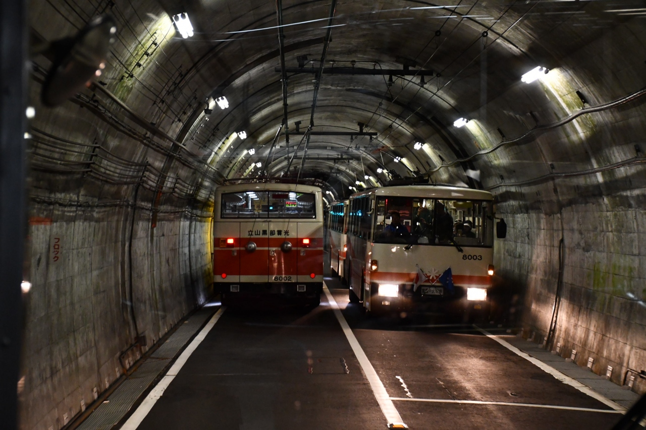 大観峰から黒部ダムに下りるトロリーバスは、今年限りです。来年からは、電気自動車で代替するそうです。トロリーバスは、重くて嵩張る電池を積まなく利点があったの利点があったので、技術を活かしたもらいたかったという気はします。