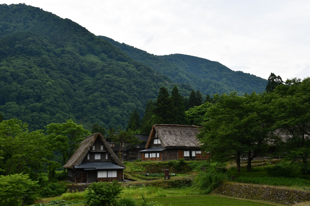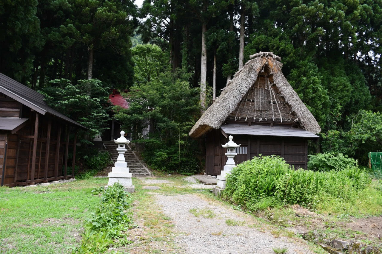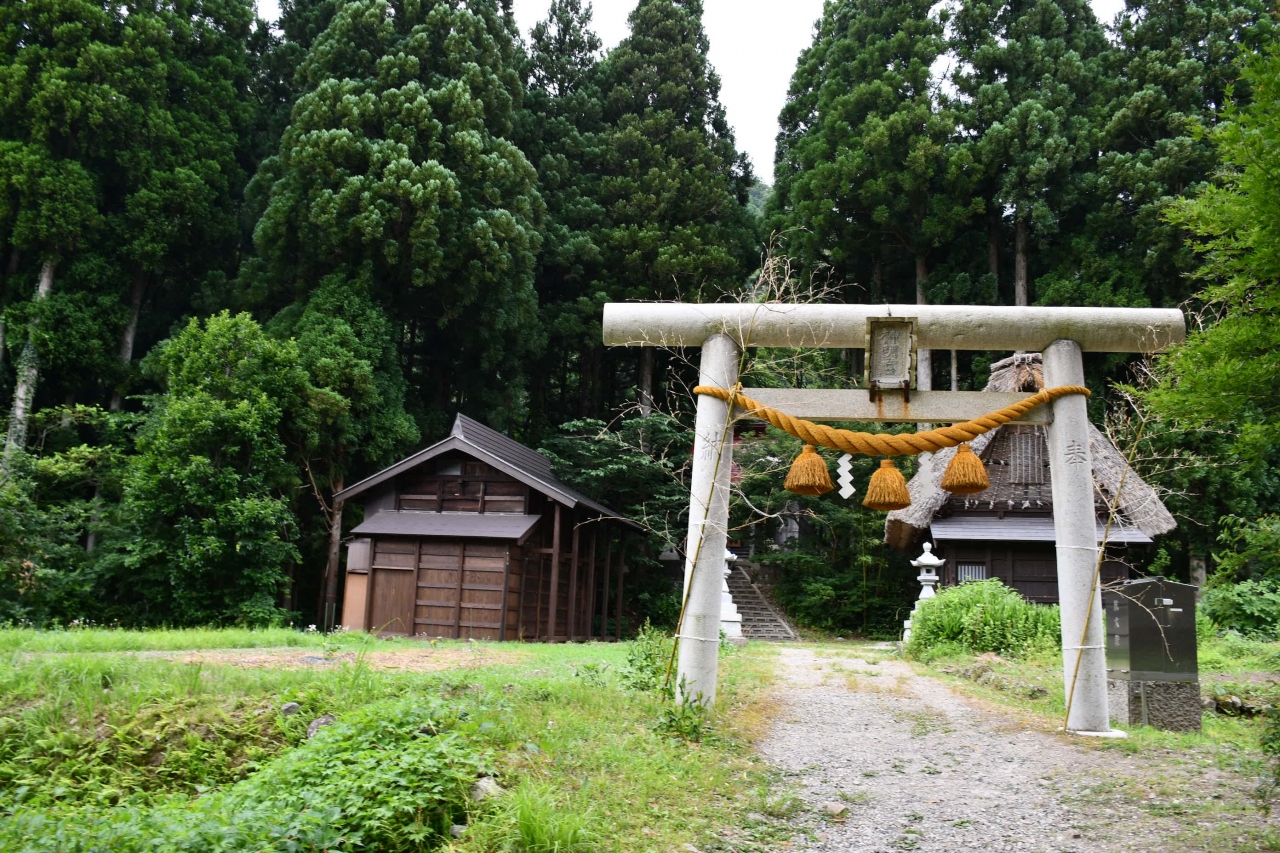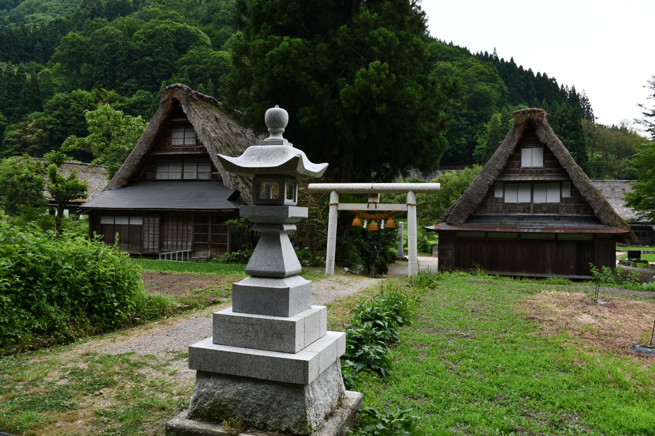 合掌造りの里、五箇山の菅沼集落にあるお宮さんです。家々を縫うように通っている道から一歩入ると、山裾で木々に覆われたお宮さんの境内です。お社は、昼間でも仄暗く厳かな雰囲気でした。ここも世界遺産の一部と考えると、有り難みが増します。