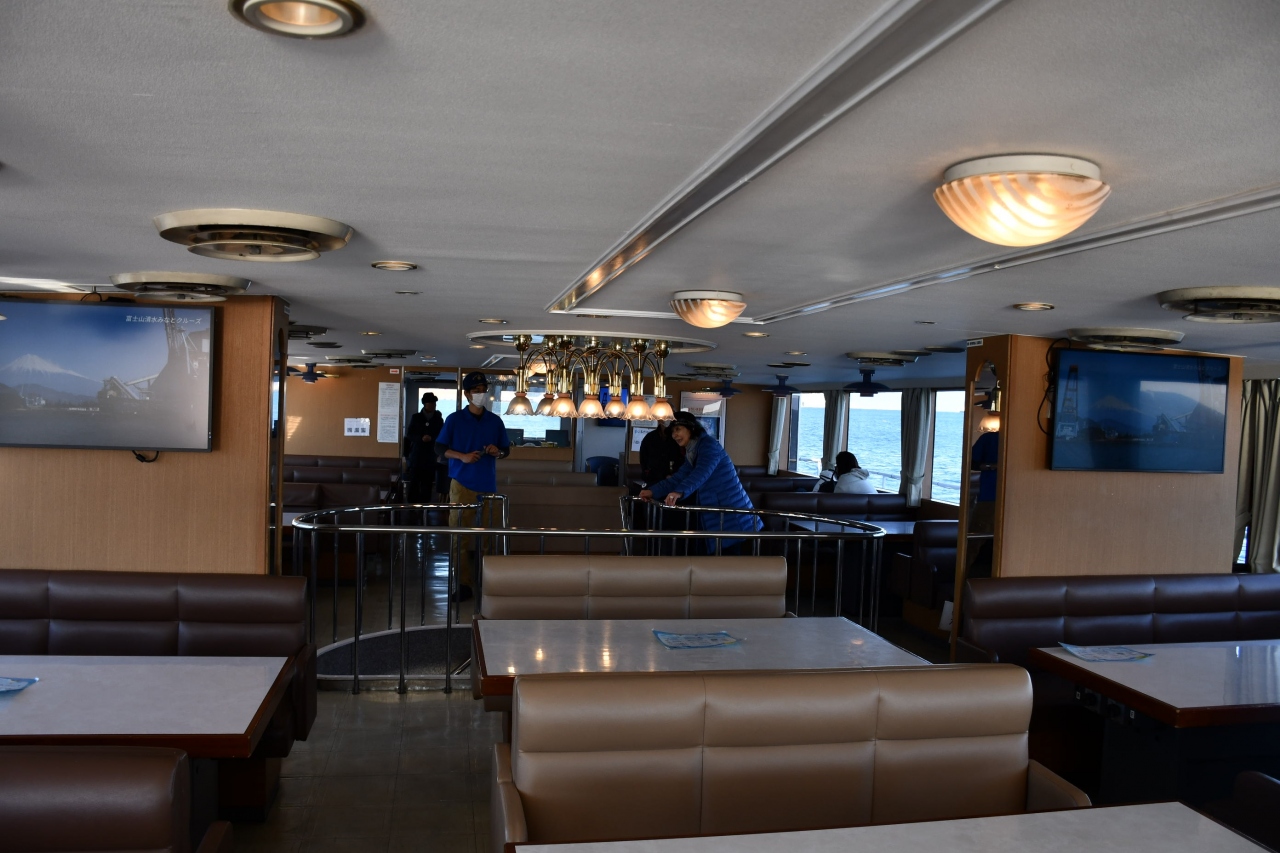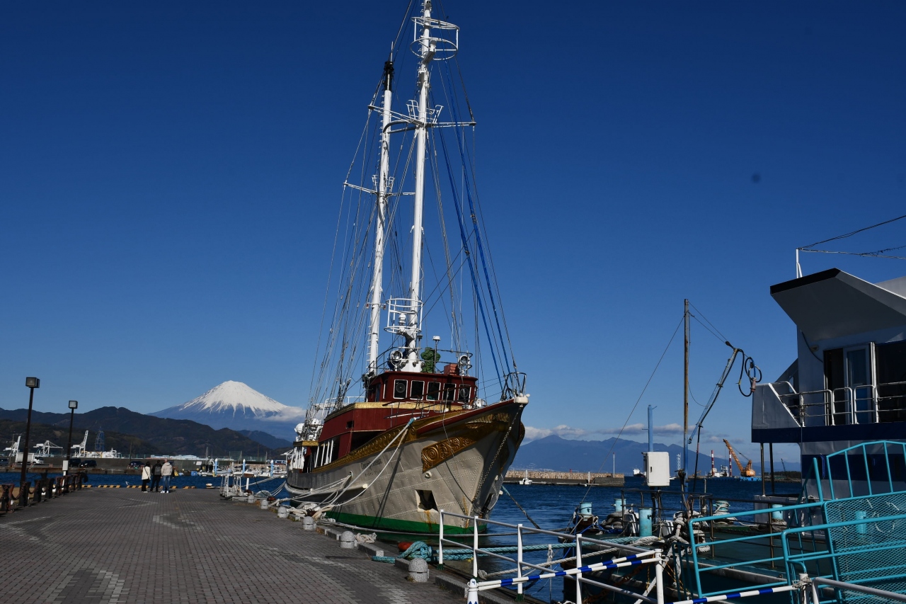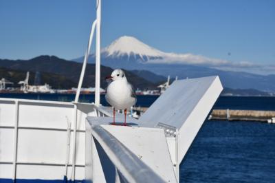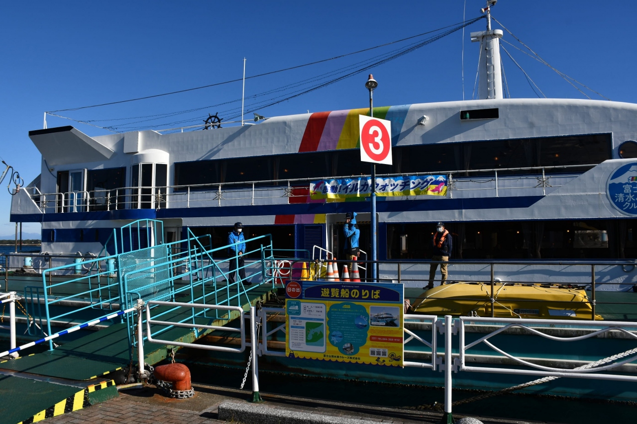 清水港からは、駿河湾を横切って伊豆に向かう航路もありますが、港内の遊覧船も出ています。三保の松原までは二十分なのですが、当日は港内を一周して四十分ということになりました。風があったせいか雲もなく、富士山の見晴らしは絶景でした。