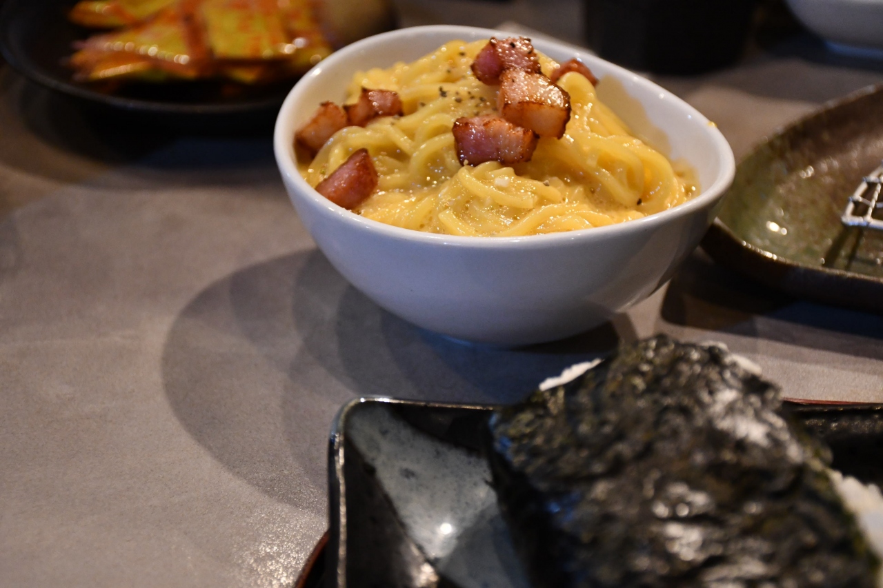 医大通りに面した、地下一階にある串揚げ屋さんです。店内は窓がない代わりに、広々としています。串揚げが中心ですが、ご飯ものや拉麺もあります。拉麺は小さな鉢で、料理の一品として註文するのに向いています。おにぎりには味噌汁が付いてきました。
