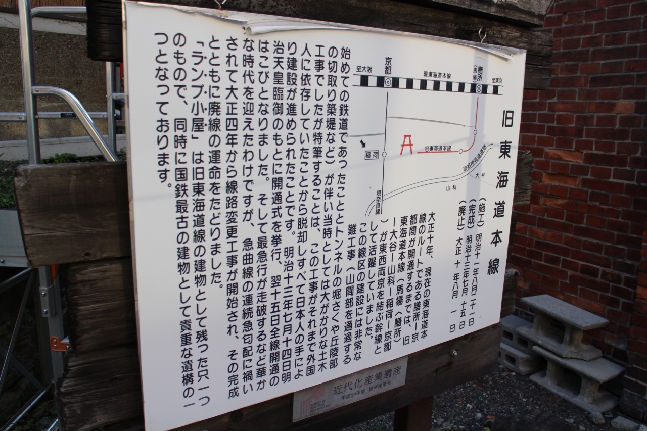 東海道線の東山隧道が開通する前、京から山科に抜けるには南に下り、一部は今の奈良線を通っていました。その頃に建てられた煉瓦造りの小屋が、稲荷駅構内に残っています。そういう経緯を記した説明板も設置されています。