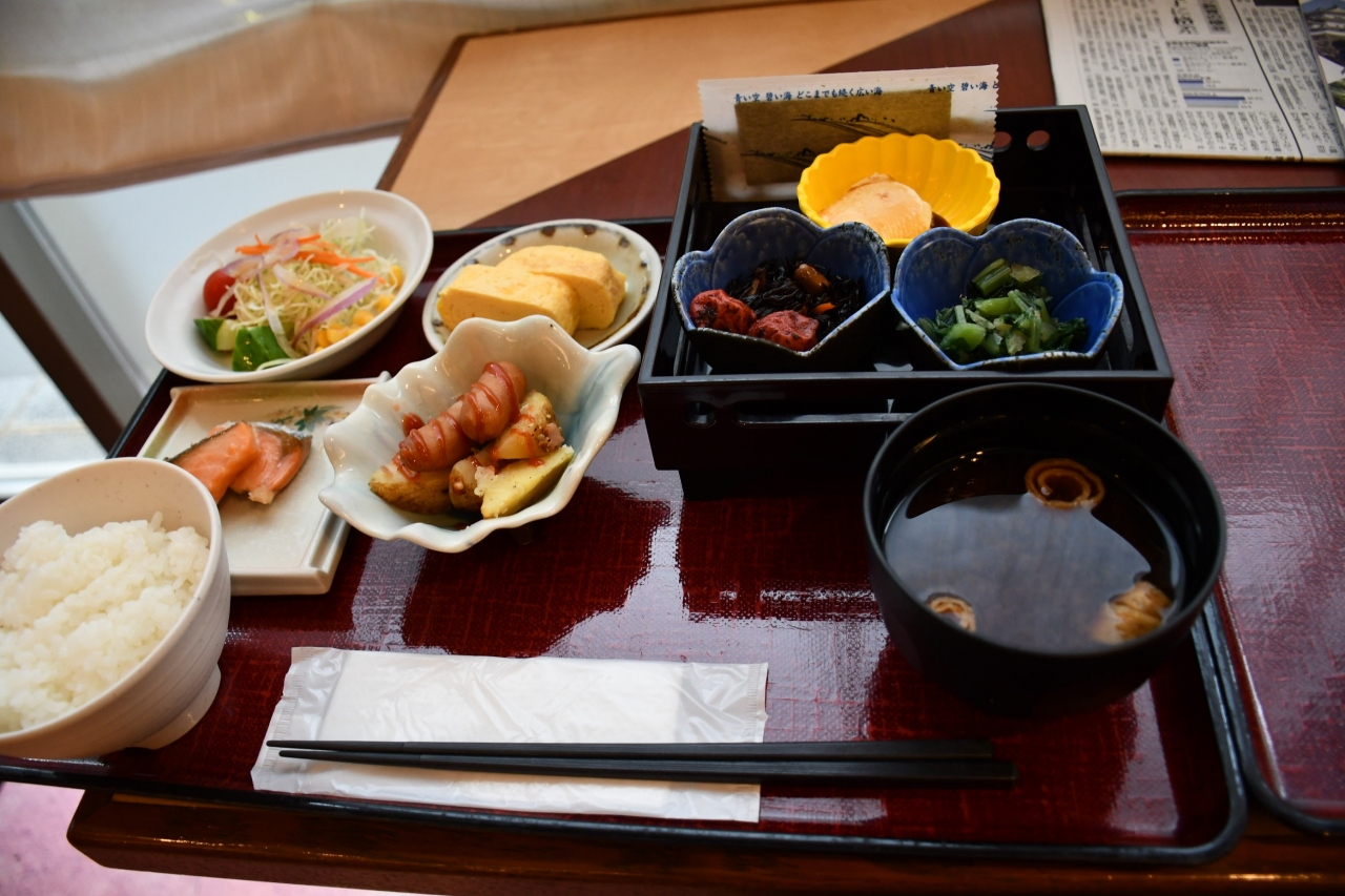 近鉄と紀勢線の津駅から歩いて一分ほどの場所、同じ敷地内にある宿の朝食で利用しました。普段はビュッフェ形式ですが、時節柄、定食になっていました。野菜が少なめの他は、ちょうど適量でした。味や調理は上々でした。