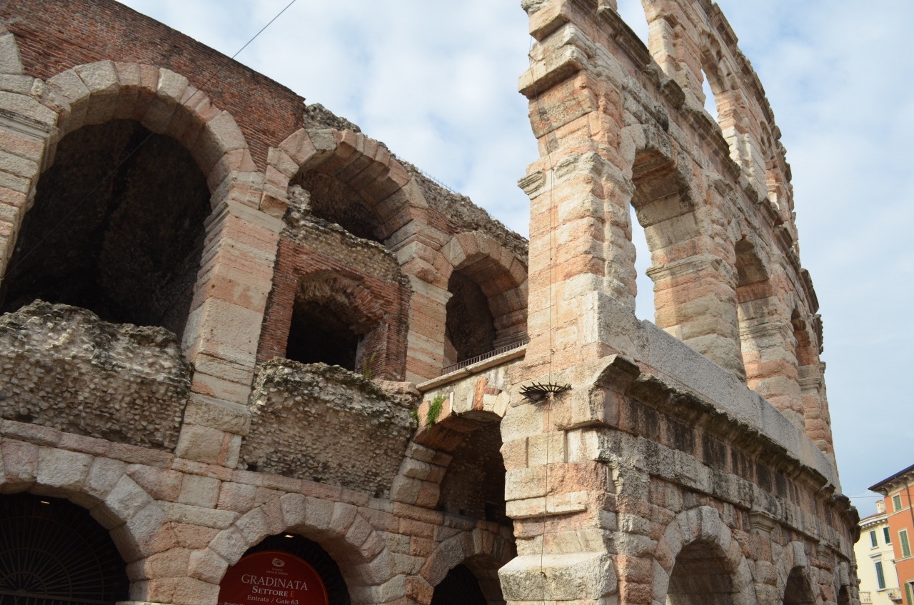 イタリア北部の古都、ヴェローナに残る円形競技場です。ローマ帝国以来の歴史を刻む建築です。ヴェローナと言えばロメオとジュリエッタの恋ですが、ローマ帝国の古代から歴史が積み重なっています。円形競技場周辺に残っている城壁もそうです。