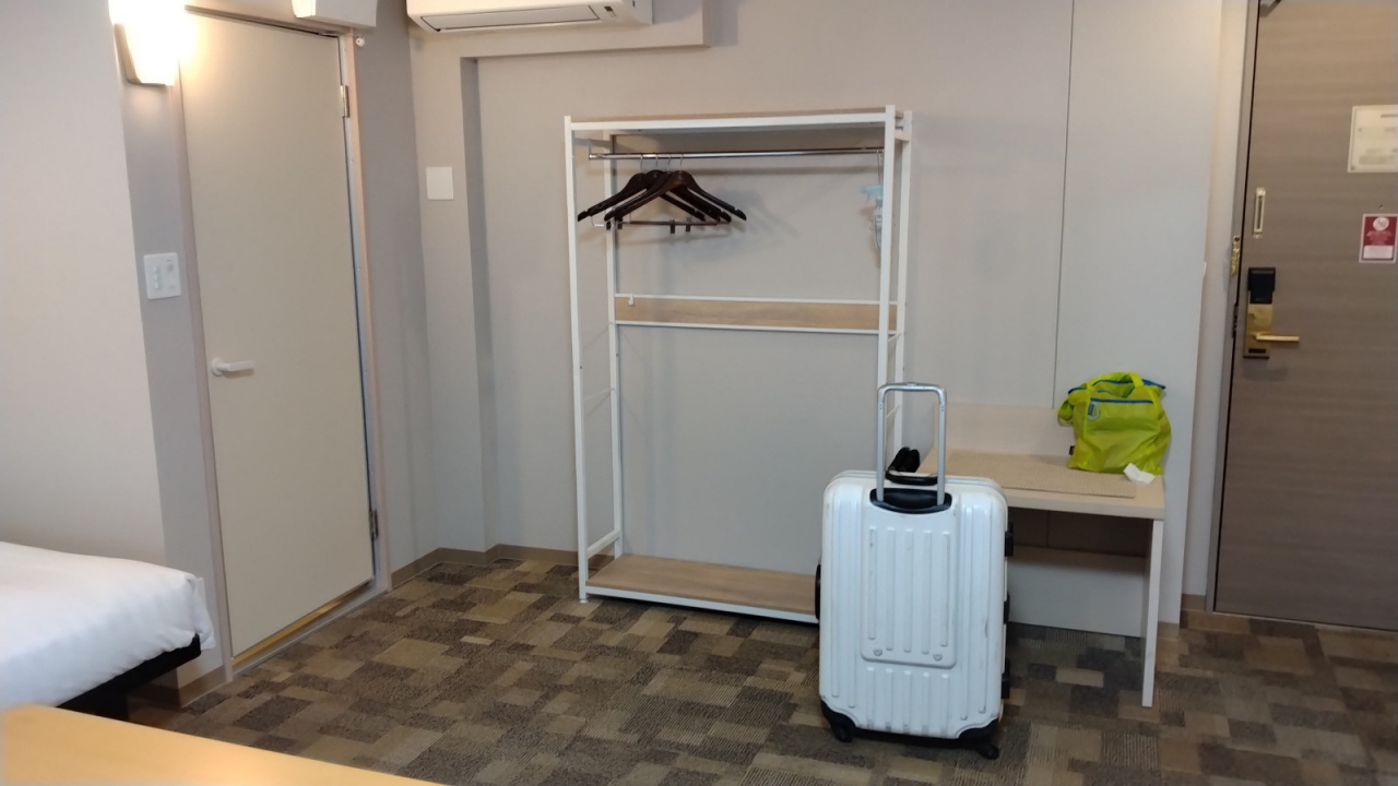 シングルの2倍以上、ツインの2倍弱で、小ぶりなダイニングテーブルを置いても荷物を広げられるほどのスペースがあります。2人分の衣類を掛けられるハンガーラックもあります。