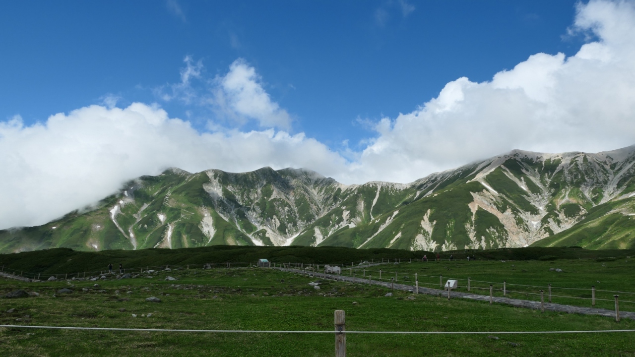 室堂平からの景観は、室堂山から始まり立山三山をメインに大日三山まで、ぐるりと3000m級の山々が取り囲み、それは見事な山岳美です。