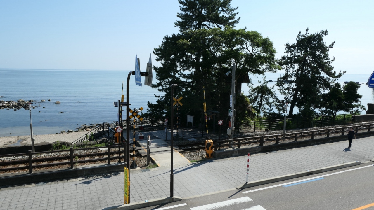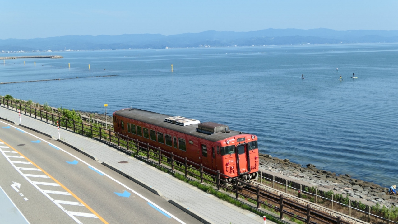 それでも湖のように凪いだ海とまっすぐの海岸線、そこを走る氷見線のディーゼル車は絵になります。