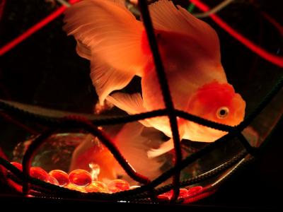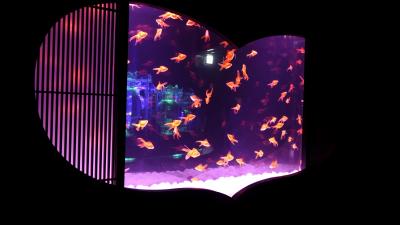様々な種類の金魚が、意匠を凝らしたショーケース(水槽)の中で泳ぎまわる、照明の色が目まぐるしく変わり、涼やかで美しいです。