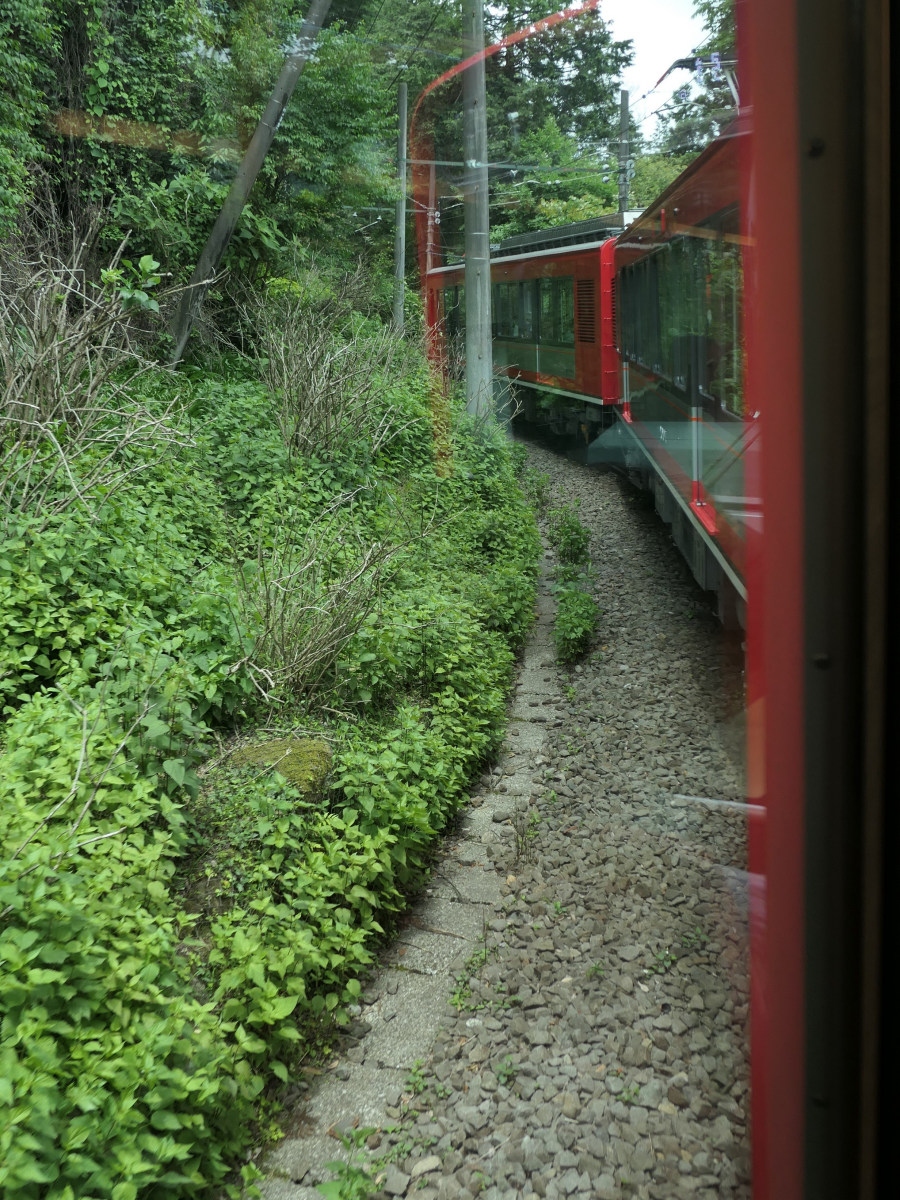 箱根湯本と強羅を結ぶ鉄道で、急勾配を登るためスイッチバック方式を採用しています。そのため、進行方向に正対してもしなくても、途中で入れ替わるので、それほど気になりません。