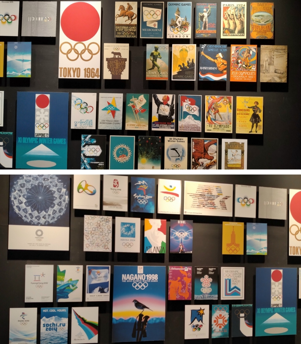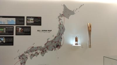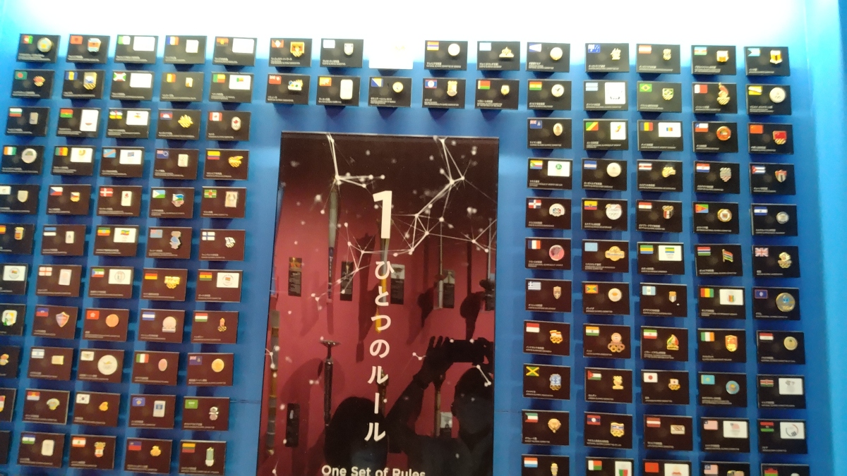 これまでの大会のトーチやバッジ、広報宣伝物などがズラリと並び、選手が使用した用具も一部展示されています。