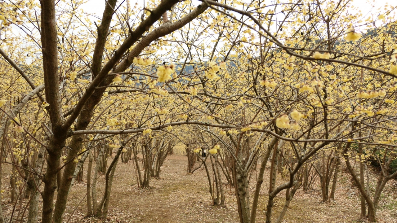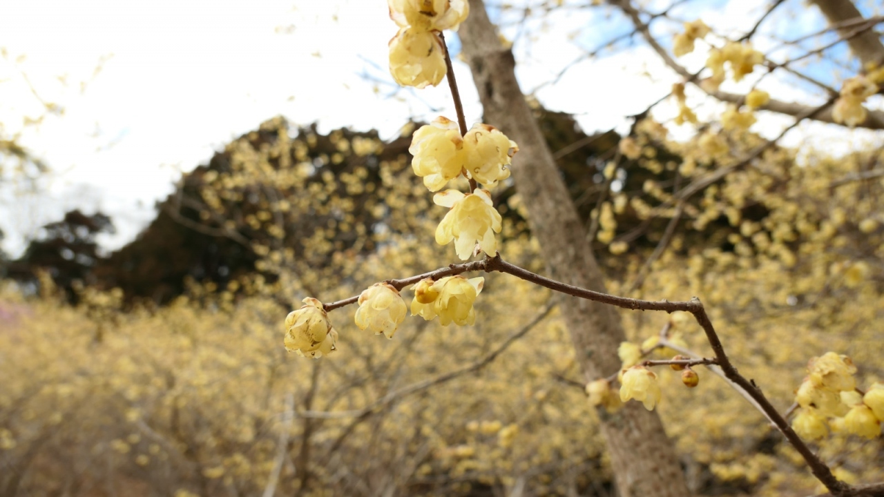 ロウバイ自体は淡い色ですが、2万本ともなると圧巻です。斜面は黄色く染まり、あたりには芳香が漂っていました。