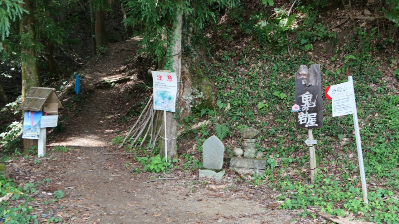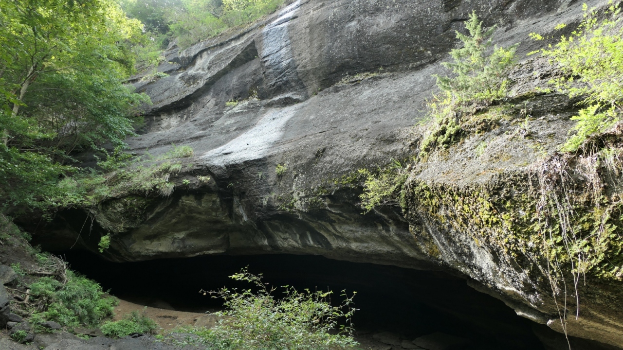 畑倉登山口から5分ほど、雨量の多い時にだけ滝がみられるとか。また、中から外を見ると入口が富士山の形になっているそうですが、現在は立ち入り禁止です。