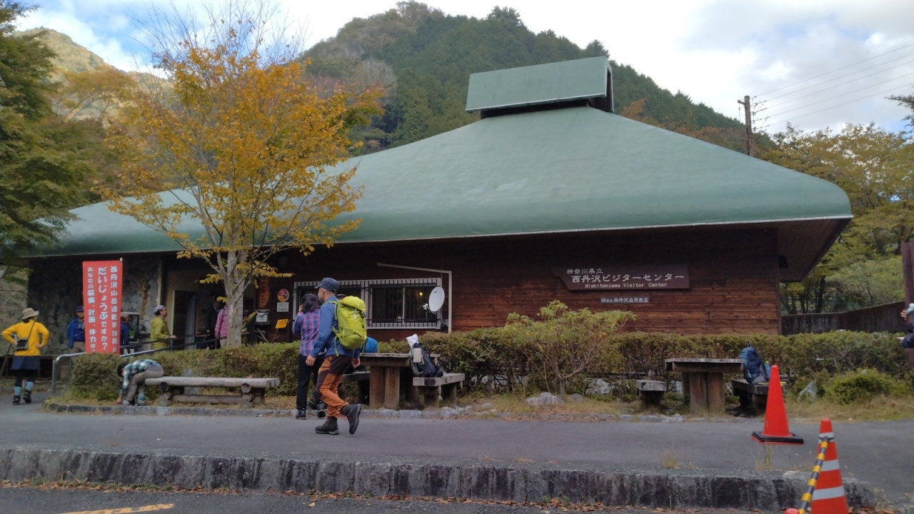 小田急線新松田駅からバスで1時間10分ほど。終点で降りて目の前の緑色の平屋建がビジターセンターです。