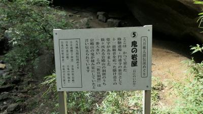 岩殿山の麓にある洞窟です。正式名称は「新宮洞窟」で、大月周辺に多い桃太郎伝説にゆかりのある場所で、岩殿山の鬼がこの洞窟を住処にしていたという言い伝えがあります。