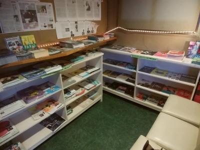 内装もレトロで良い感じ、ちょっとした資料コーナーなどもあります。
