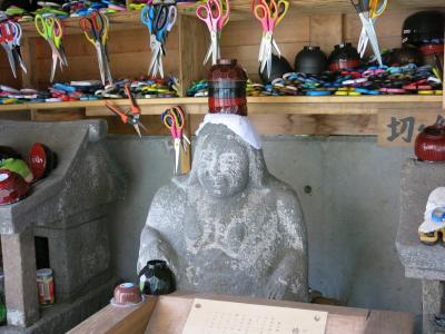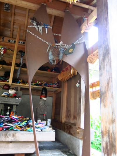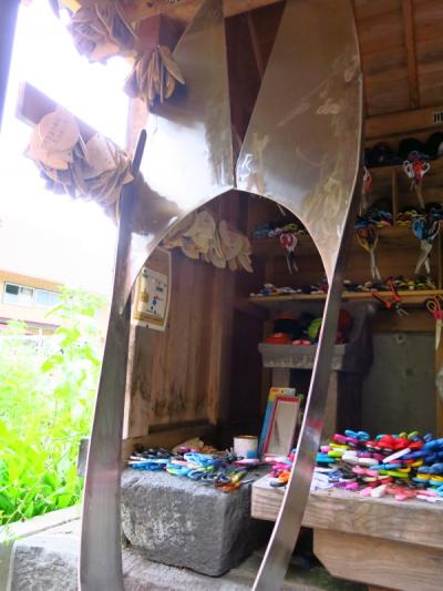 ばんばが鎮座する祠の左には見るからに切れ味鋭い、右には錆びた大きな握りばさみが置かれています。これが縁切りと縁結びを象徴しているわけですが、当然面白いのは左側です。