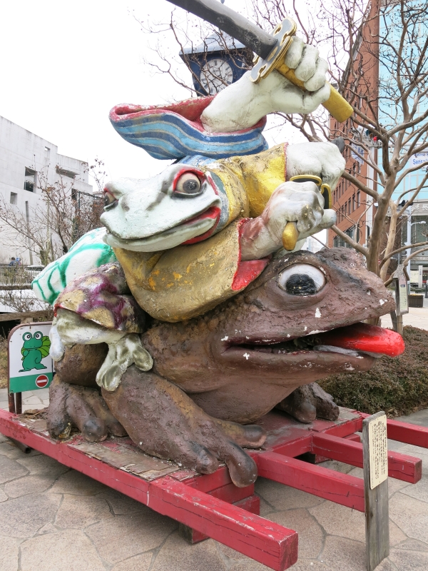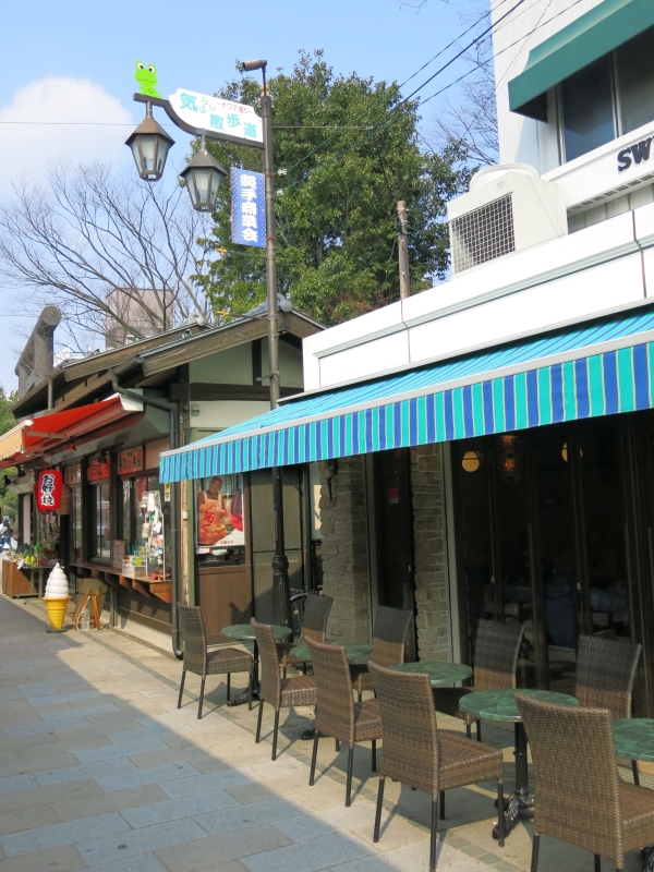 この商店街のマスコットキャラクター(?)は、女鳥羽川には河鹿蛙が沢山棲んでいたことからカエル。商店街の入口には、東京芸大が制作したオブジェが鎮座しています。- 旅行時期