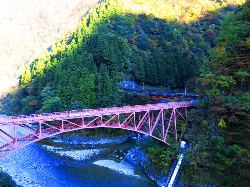 トロッコ電車で新柳河原発電所を過ぎてほどなく、黒部川が二俣に分かれる場所にかかる猿専用の橋。