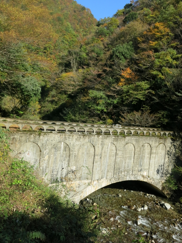 川沿いに右手に進むと、V字谷の壁に張り付くような細い道が続き、今は使われていない立派な石造りのアーチ橋が現れます。