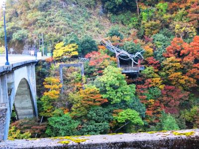 宇奈月温泉街の端、黒部川にかかる想影橋の袂に、周囲の風景を切り裂くような前衛的なオブジェが目を引きます。