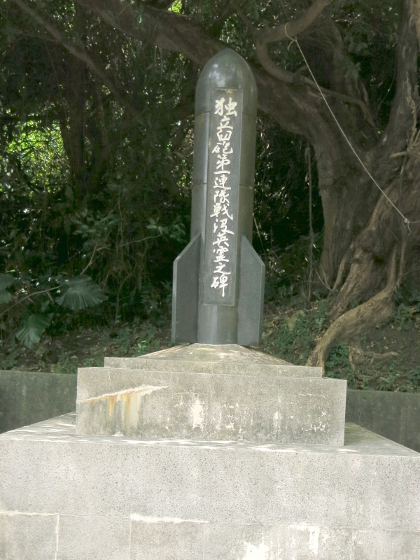 この慰霊碑はロケットミサイルの形を模してあり、碑文によると、これは秘密兵器98式臼砲原形に基づいて実物大で造られたものとあります。