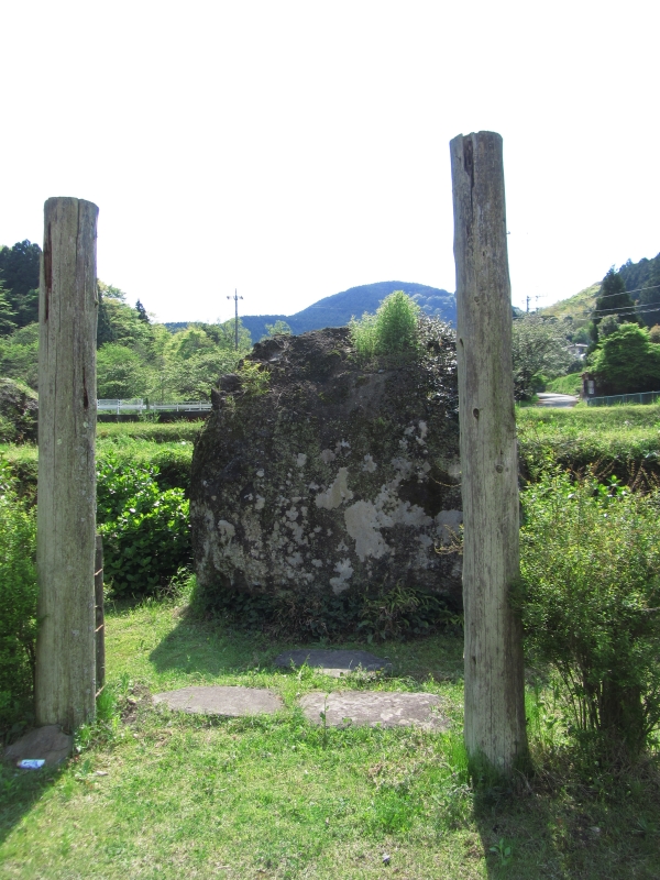 小さな木製の柵で囲われたのが「かぶと石」、裏手の田んぼの中にポツンとあるのが「たいこ石」。これらをまとめて「遊び石」と呼びます。