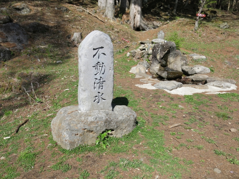 登山道入り口から少し歩くと最初の分岐「五叉路」があり、そこから10分ほどの小広い広場が不動清水です。