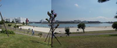 入江になった場所をビーチに作り変えて造られた公園で、広い芝生の斜面が広がり、その先に砂浜。海と言っても入江でかつ倉庫街ですから、一般的な海水浴場の風景とは全く違います。