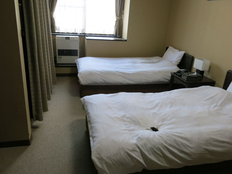 ツイン+2段ベッドで広いのは良いのですが、ベッドの上は乱雑に置かれた布団と梯子が投げ入れてある始末。それを隠すようにカーテンが引かれています。