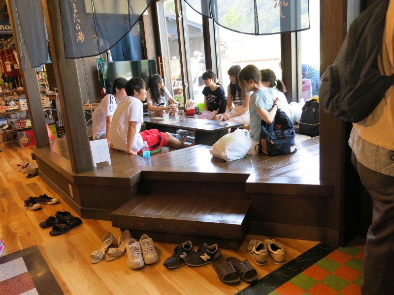 靴を脱いで上がります。囲炉裏もあり、座卓が5~6つ。