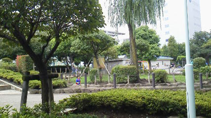 小ぶりな広場に水遊びができる池、そしてフットサルコートとテニスコート。これだけの小さな区立公園です。