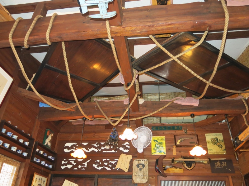 立派な太い梁がむき出しになった居間に通され、室内を見るとそばちょこがズラリ、あしたのジョーもズラリ(笑)、クラシックバイクの模型もズラリ・・・