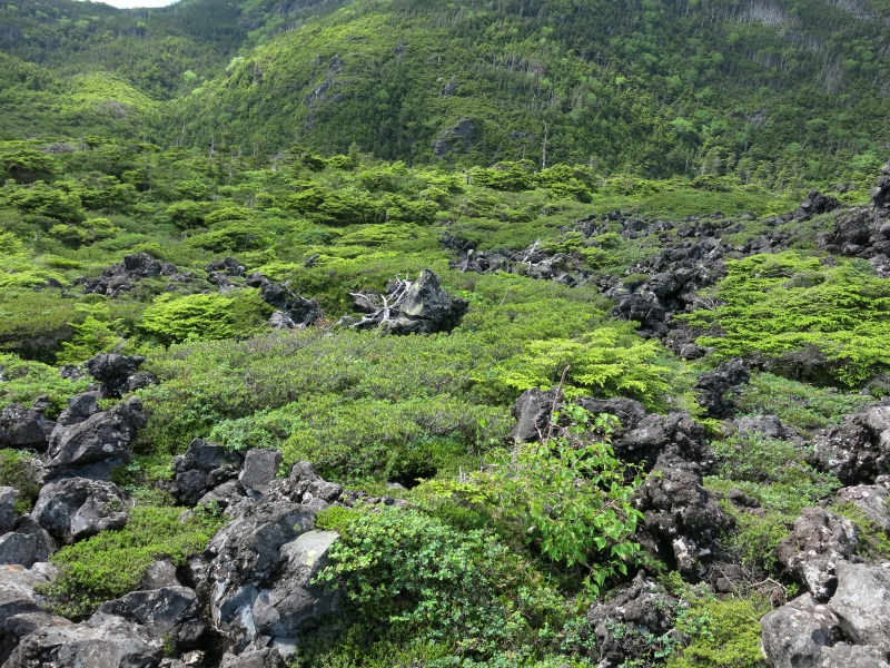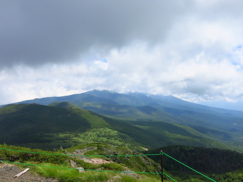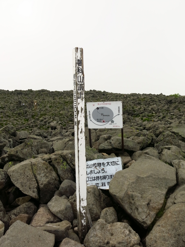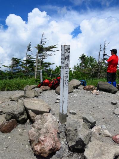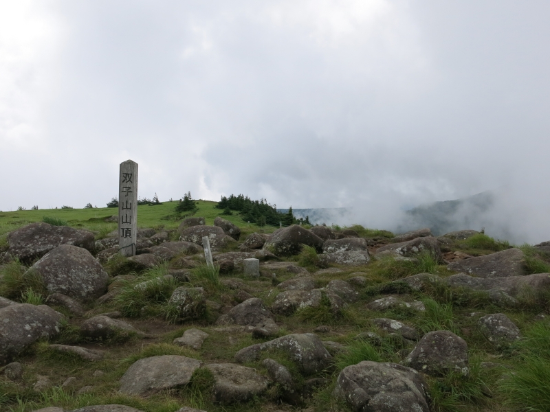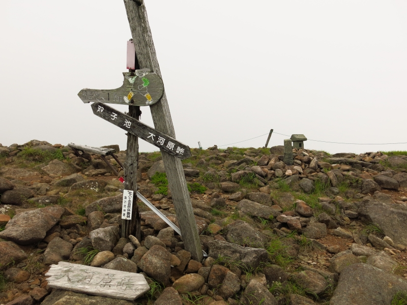 この双子山は、大河原峠から30分ほどで登れる山です。標高2223mの山頂は、このエリアの山特有の、大きな岩がごろごろした特徴ある景観。眺望は利くはずですが、私たちが行った時はあいにくガスが出ていました。