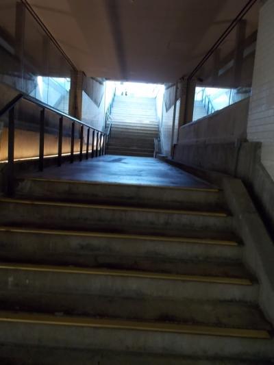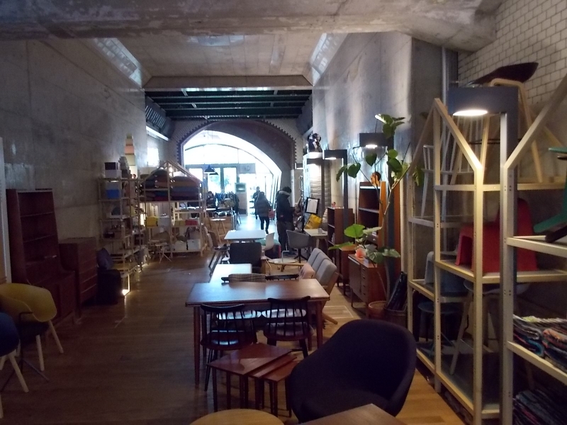 その駅の階段、壁、プラットフォームなどの遺構をそのまま使って、カフェや雑貨が入るちょっと洒落た商業施設に生まれ変わりました。