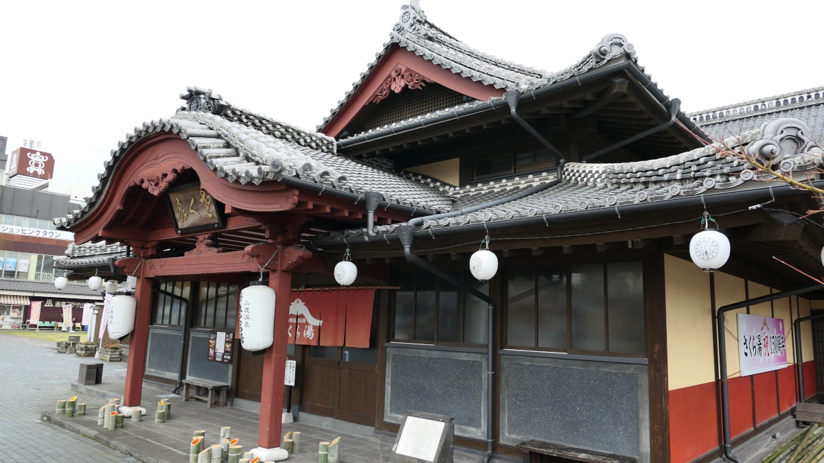熊本バスターミナルから「山鹿温泉行き」のバスに乗り約1時間。「山鹿温泉」バス停で下車すると目の前にあります。