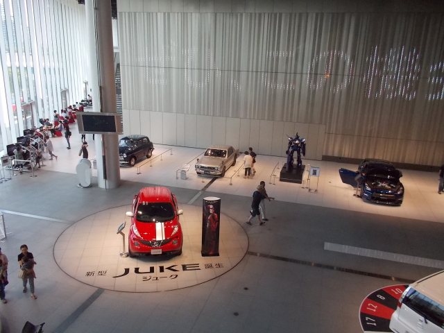大きな吹き抜けのショールームには、日産車がズラリ(外にもあります)。