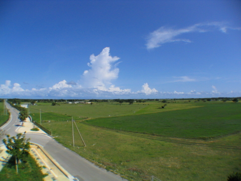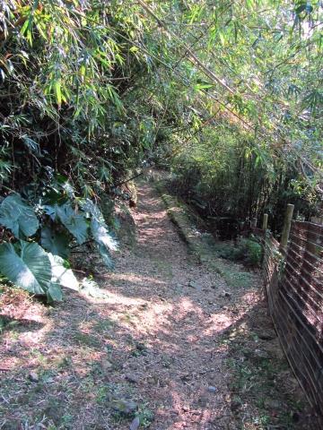 細い農道のような道を上がって行き、グスクの入口を示す標識に従って車を停めると、畑の脇を通る小道が見つかる。