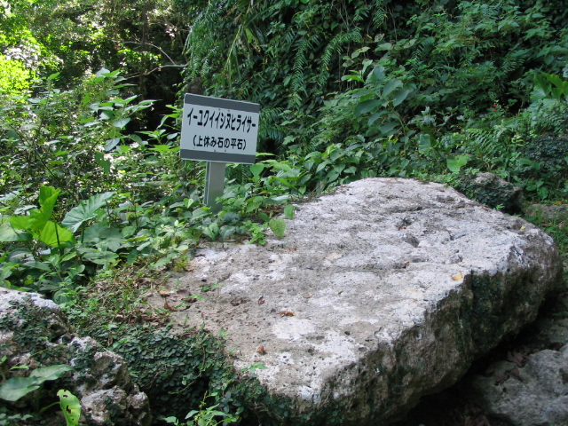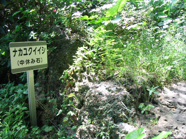 ということは、帰りは水を担いでの登り坂。そこで坂の途中に、腰掛けて一休みできるように石が置かれている。その名も『ナカユクイイシ』=中休み石と『イーユクイイシヌヒライサー』=上休み石の平石。