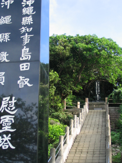 摩文仁の丘からひめゆりの塔に向かう途中、米須海岸方面への道を曲がって行くと、海岸沿いに多数の慰霊碑が地配置されている。