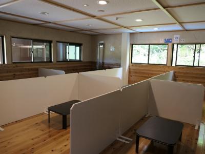 コロナ感染対策として、一人ごとの間仕切りは高さ60cmほど。果たしてどれほどの効果があるのか疑問です。