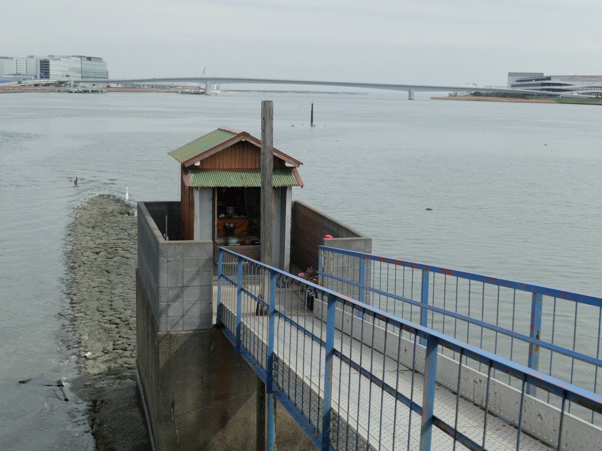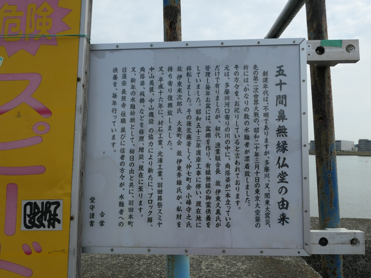 関東大震災の火災、東京大空襲などでは、かなりの数の水難者が無縁仏となって品川海岸や河口部の五十間鼻に漂着し、これらを供養するために建てられたのが、先端の小さな祠、「無縁仏堂」です。