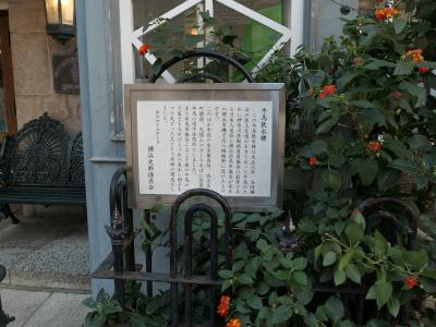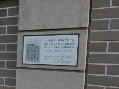 間近に元町・中華街駅の出入口がありますが、その壁面がちょっと凝った造り。よくよく見ると、これも「ビンセンド商会」という婦人服裁縫所の建物外観をイメージしたもの、という解説のパネルがはめ込まれています。
