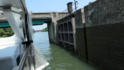 さて肝心の「中島閘門」は、高さ(水位)の異なる水路をつなぐための設備で、水位差を二対の扉で調節する方式(前後のゲートを交互に開閉することで水位の異なる水面を調整)で、これを「閘門」というのだそうです。パナマ運河と同じ方式とのこと。