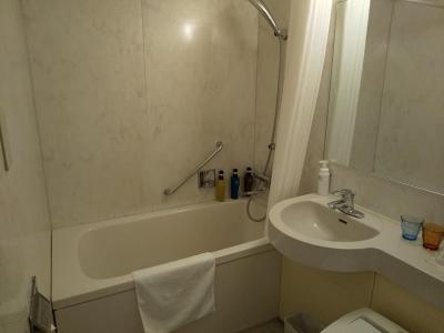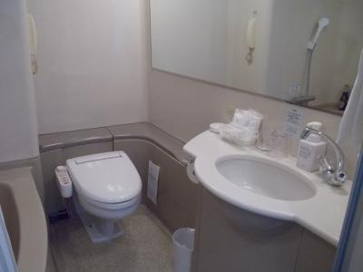 部屋の広さはビジネスホテルとして標準的、バスルームはやや広め。