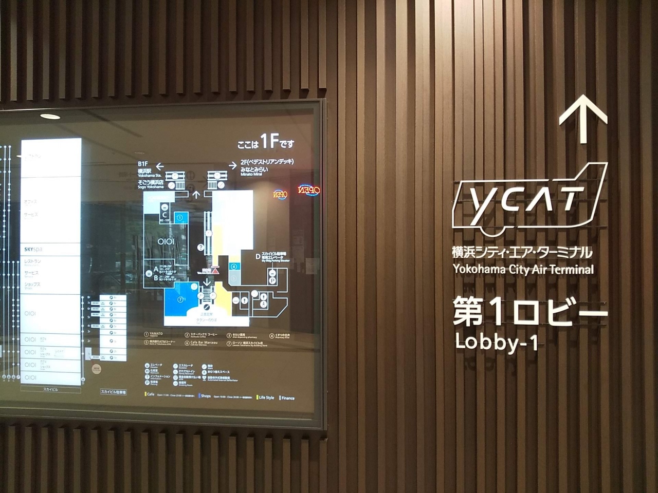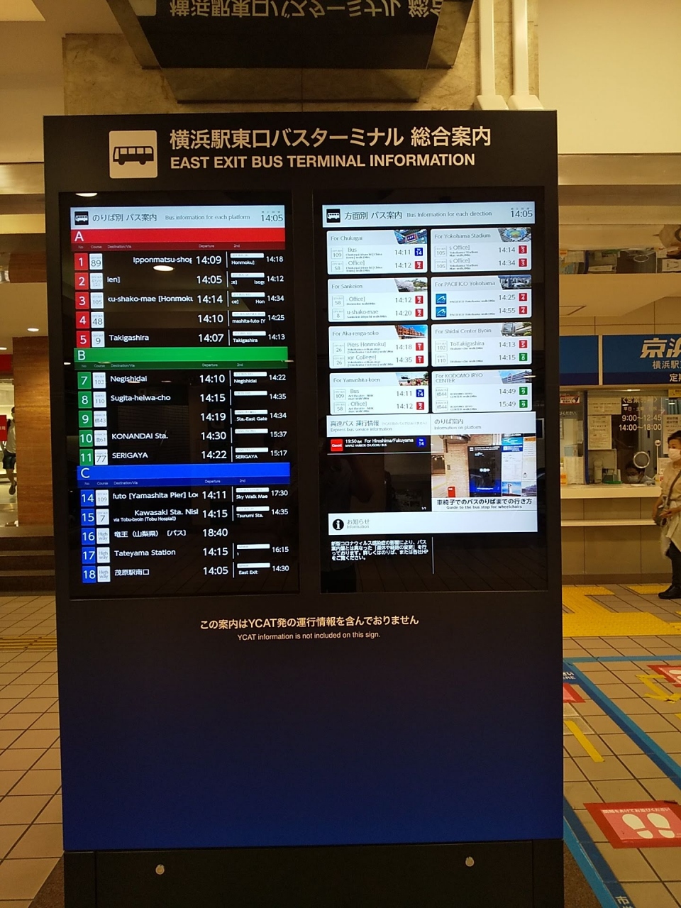 横浜駅東口の地下街ポルタを抜け、そごう・スカイビルのエリアに入ったら、バスの案内板をよく確認しましょう。1階部分に有人カウンターと大きな電光掲示板がありますので、自分が乗りたいバスの発着番線を見つけやすいと思います。