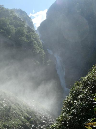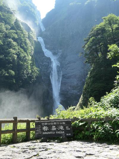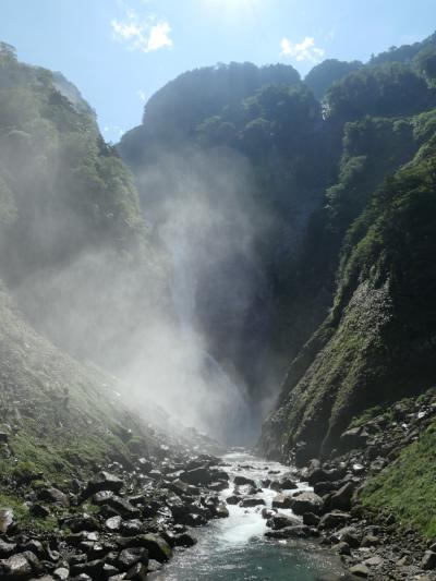 立山駅から称名滝行きのバス(片道500円)、30分ほどで終点。そこから10~15分ほど歩くと目的地に到着です。途中、姿は見えなくても地鳴りのような音(水の落ちる音)が聞こえてきます。峡谷の最深部は水煙で霧がかかったような状態、さらに近づくとほぼ霧雨状態。おかげで晴天であれば虹が見え、天然のミストシャワーを浴びることができます。(カメラ等の精密機器は十分ご注意を)