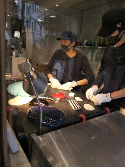 ここは路面店なので、ガラス張りの店内が良く見え、洋風金太郎飴ともいうべきキャンディーの製作工程を見物できます。